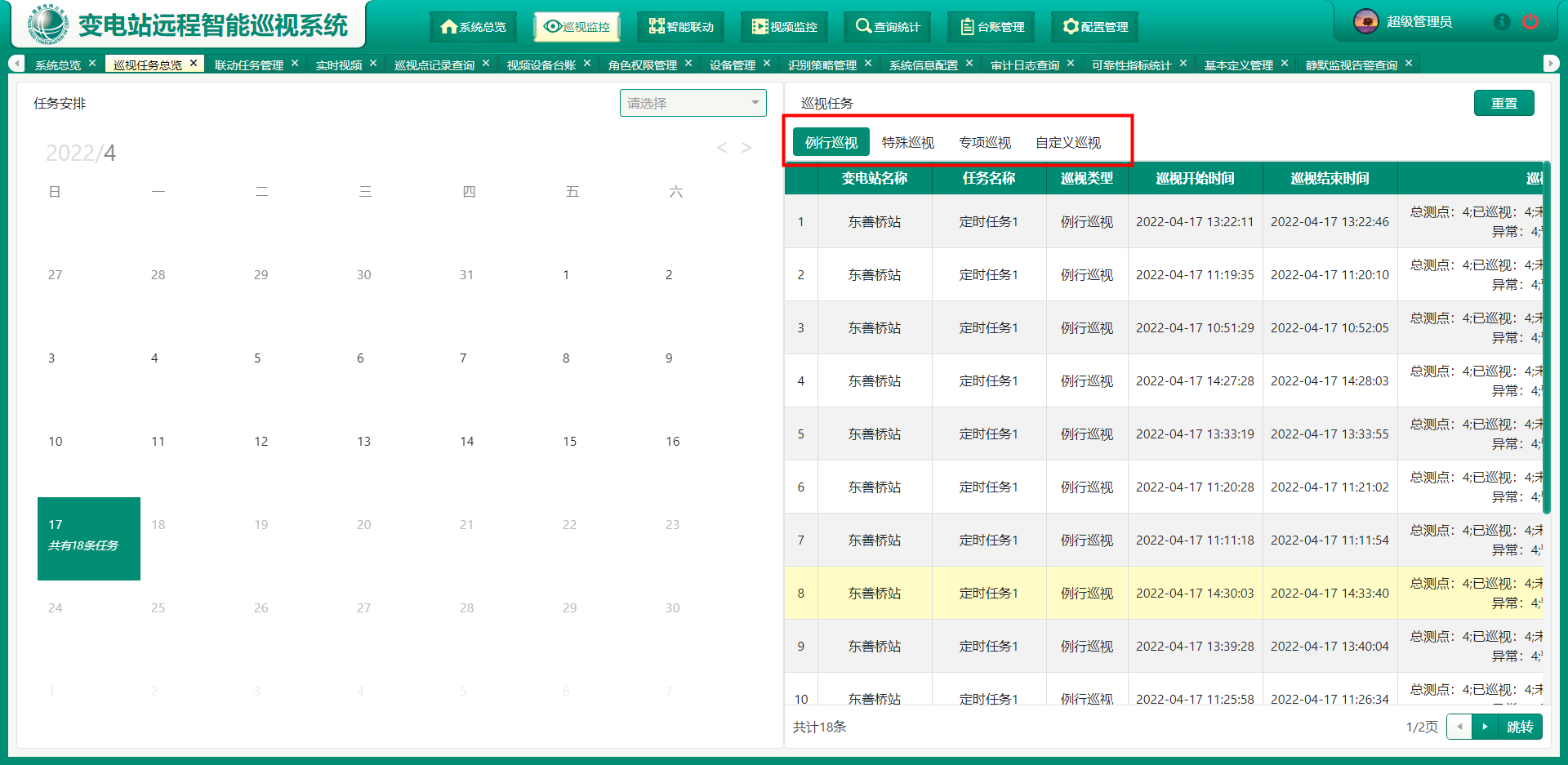通过人工智能技术的应用,实现可视化巡视图像的智能识别、自动分类、数据分析,配合自主巡视任务制定,实现例行巡视、特殊巡视、专项巡视、自定义巡视及静默监视,有效降低运维人员巡视工作量和巡视压力。