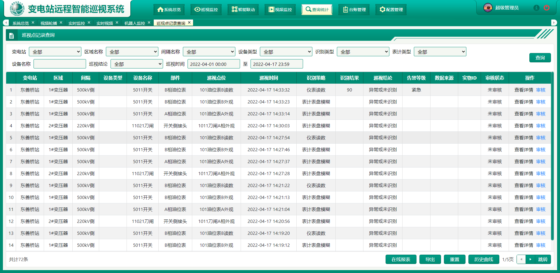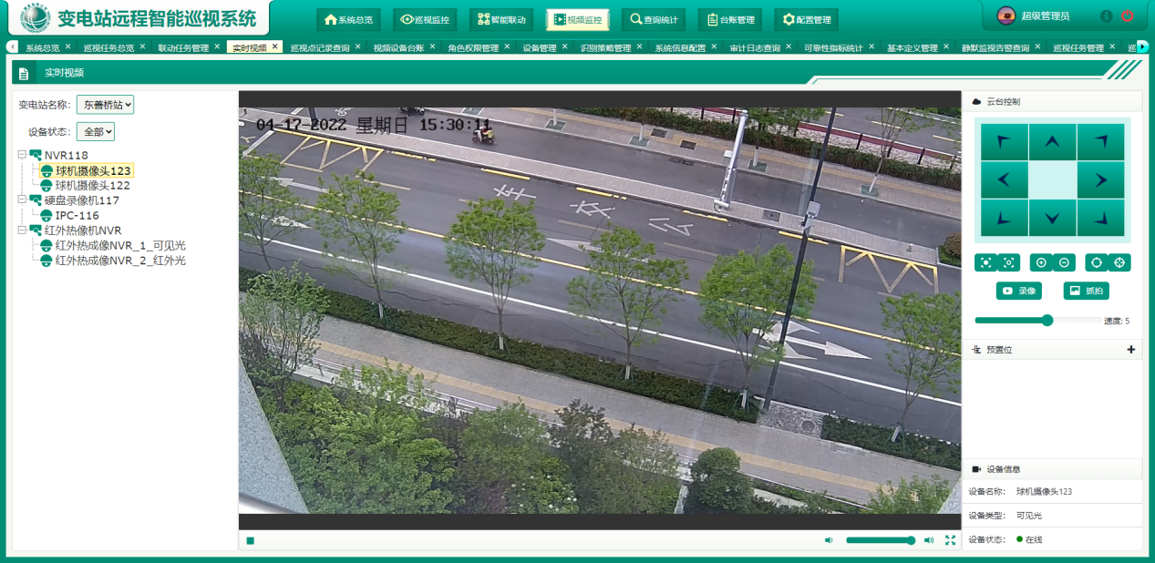 变电站远程智能巡视系统通过各类高清摄像机和室内外巡检机器人对现场巡视点位进行抓图和视频录制,利用人工智能图像识别技术,对设备、人员、环境、缺陷等进行智能化分析判断,从而实现变电站的智能化远程巡视。